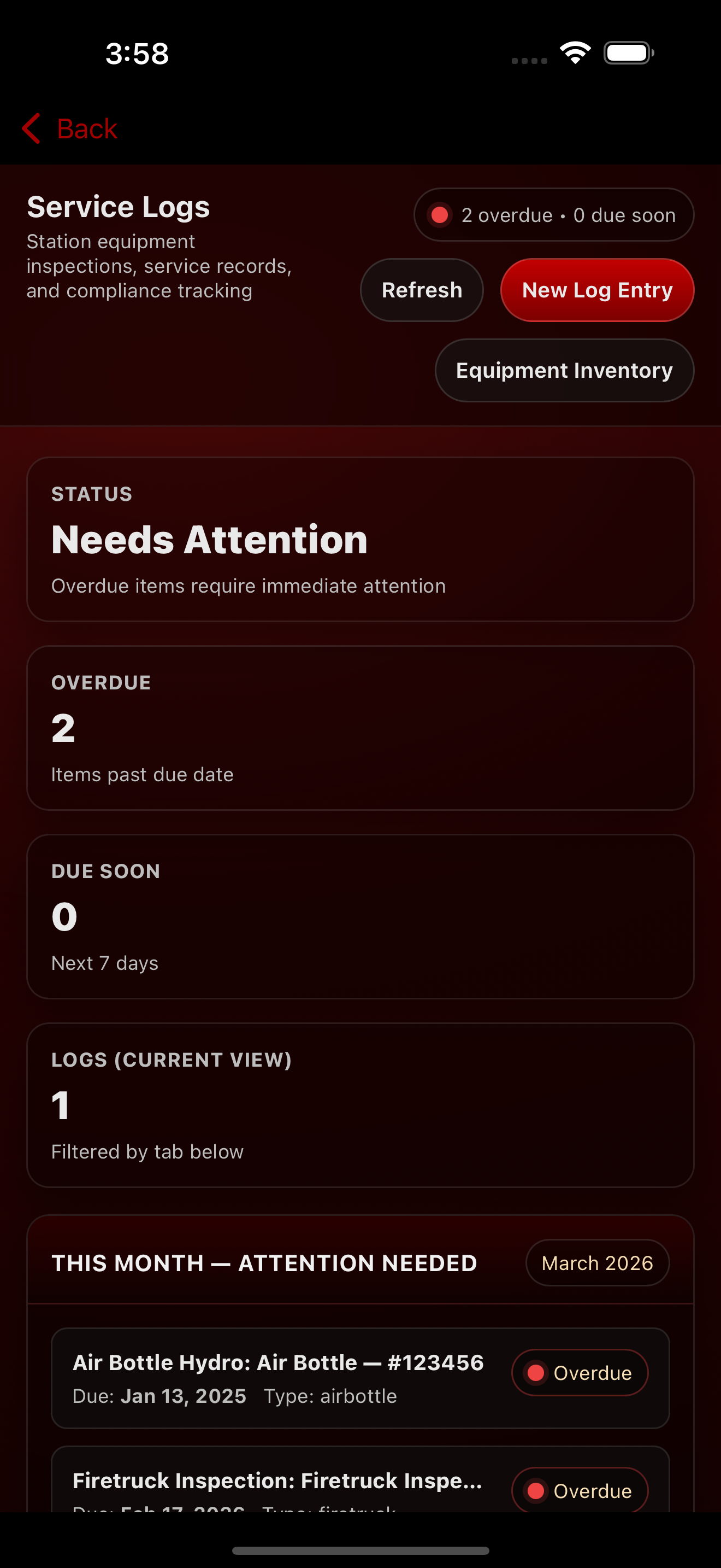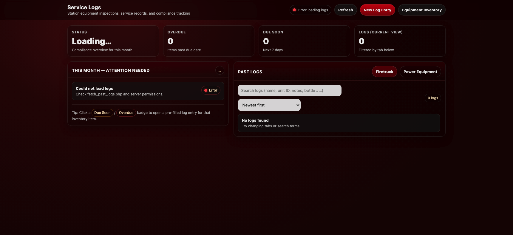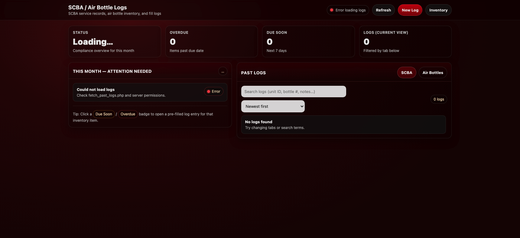 Includes service logs, SCBA workflow, bottle tracking, and admin review tools.